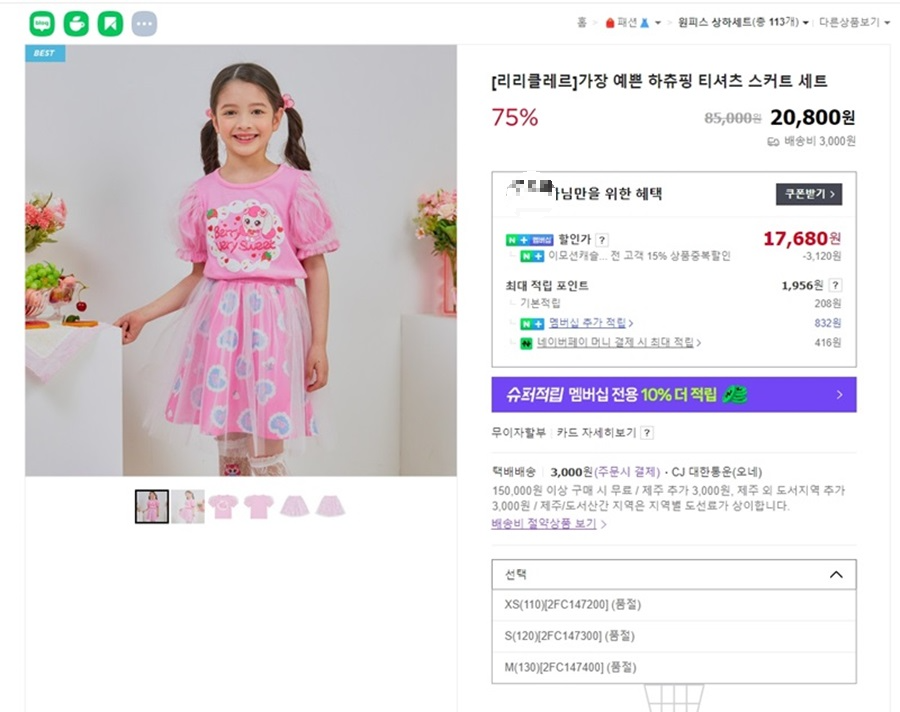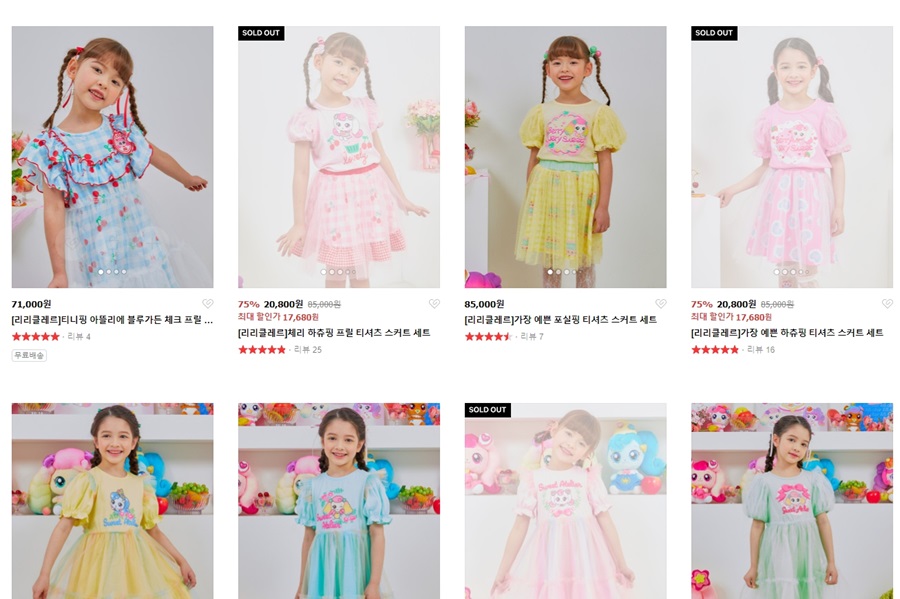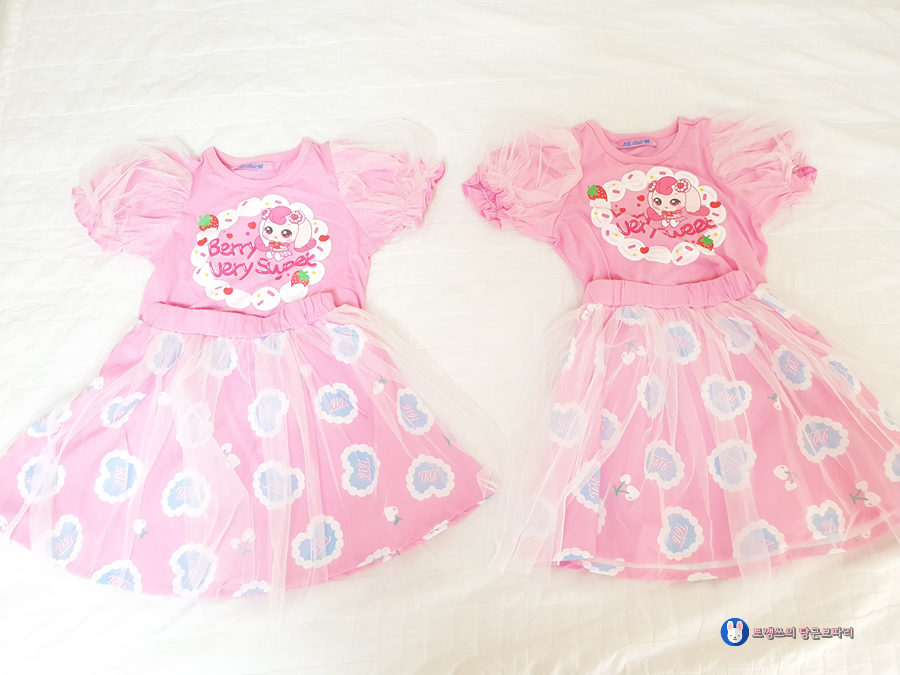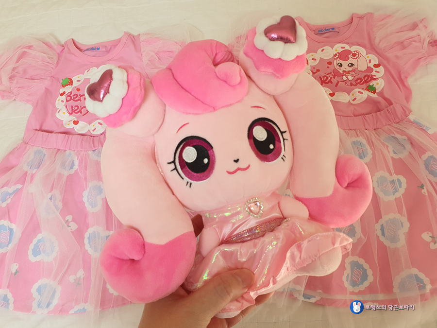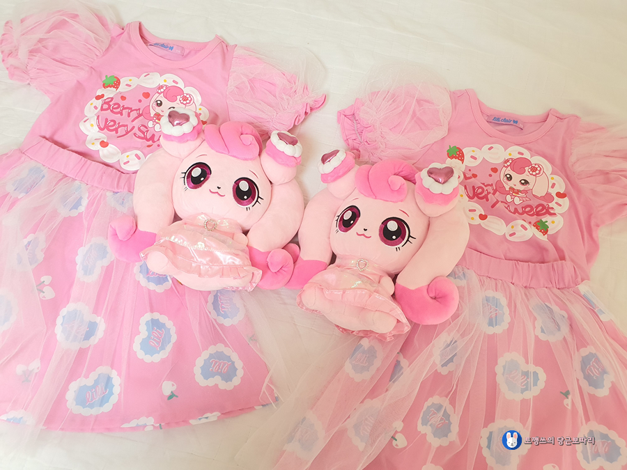 저는 드레스입은 여리여리 하츄핑과 쨍한 찐 분홍 하츄핑 둘 중 드레스 입은 하츄핑을 픽했습니다. 그리고 75% 할인이 들어간 하츄핑 티셔츠 스커트 세트도 구매했습니다. 처음에는 체리 하츄핑 프릴 티셔츠 스커트 세트를 봤는데 110 사이즈가 모두 품절이어서 사이즈가 남은 제품으로 선택했습니다. 두 제품 모두 너무 예쁘죠? 티니핑 아뜰리에 블루가든 체크 프릴 원피스는 방송인 이지혜씨 유튜브에서 딸 태리가 입고 있던 모습을 봤던 거 같은데 아직 가격할인은 하지 않는 것 같습니다.