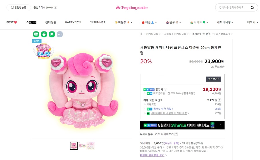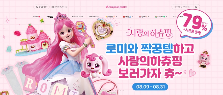 사랑의 하츄핑을 재미나게 보고 온 둥이들은 며칠 째 로미공주와 하츄핑에게 빠져있답니다. 엄마 말을 잘 듣는 친구에게 사랑의 하츄핑이 선물을 보내줄 거라고 했더니 밥도 잘 먹고 정리도 척척 잘하는 아이들의 순수함에 미소 짓게 됩니다. 지난주 홈플러스에 갔을 때 아이들이 하츄핑 인형을 사고 싶다고 했었는데 마트 가격이 온라인 보다 더 비싸지 않을까 싶어 보류했습니다. 깜짝 선물을 줄 겸 온라인으로 하츄핑 인형을 찾아봤는데 이모션캐슬 스토어에서 오프라인보다 좀 더 저렴하게 판매하고 있었습니다.